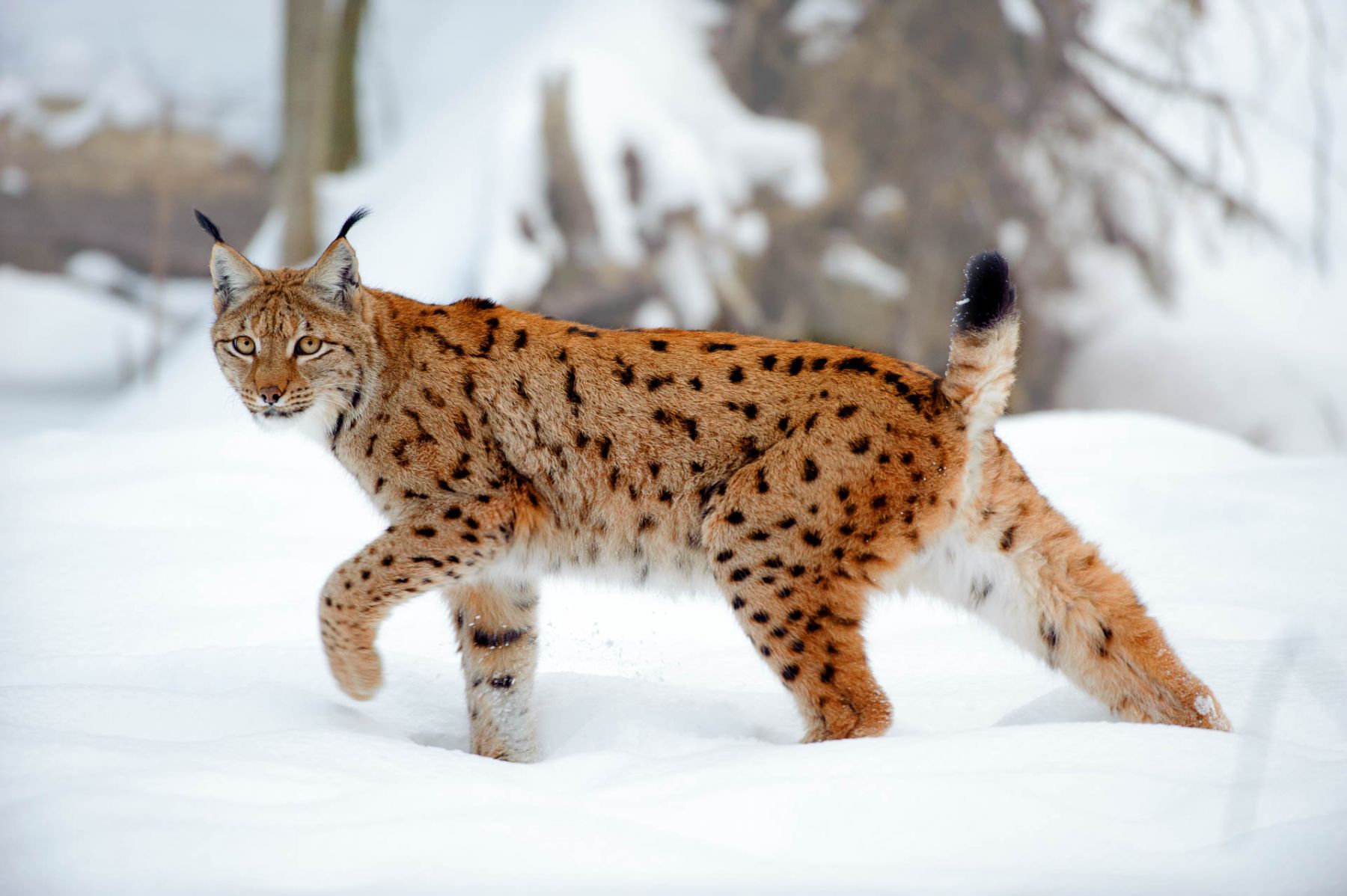 Eurasischer Luchs im Schnee mit markanten Ohrpinseln, im Profil.