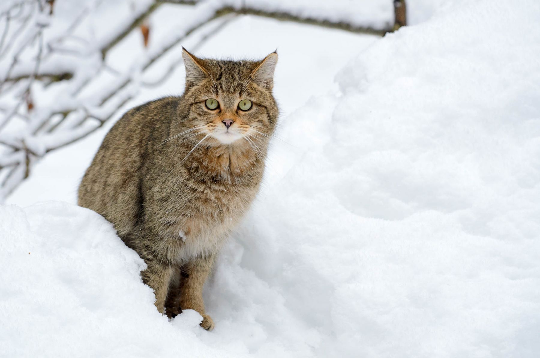 Europäische Wildkatze steht in einem Schneehügel und blickt aufmerksam.