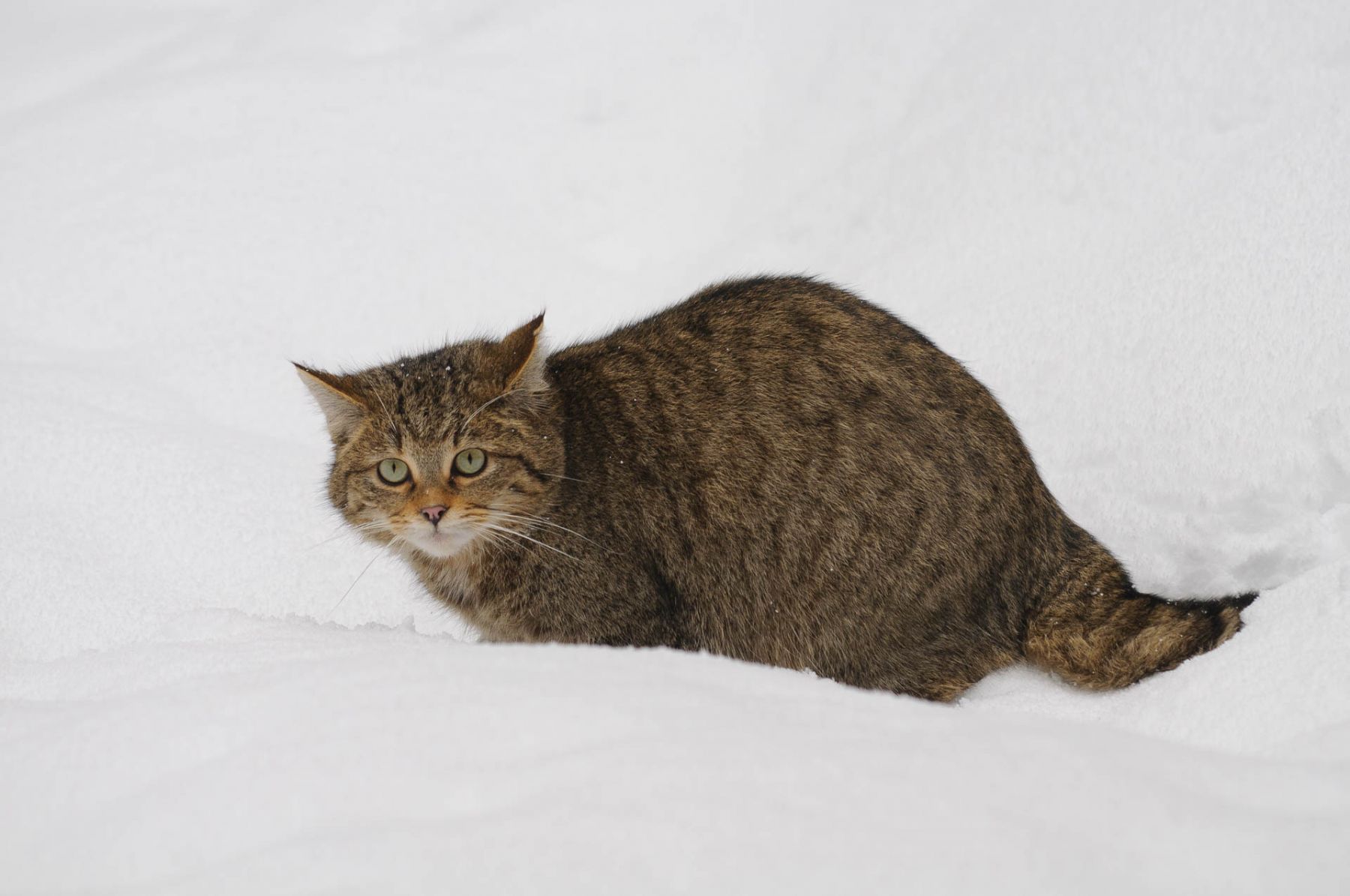 Europäische Wildkatze im Schnee, geduckt in winterlicher Landschaft.