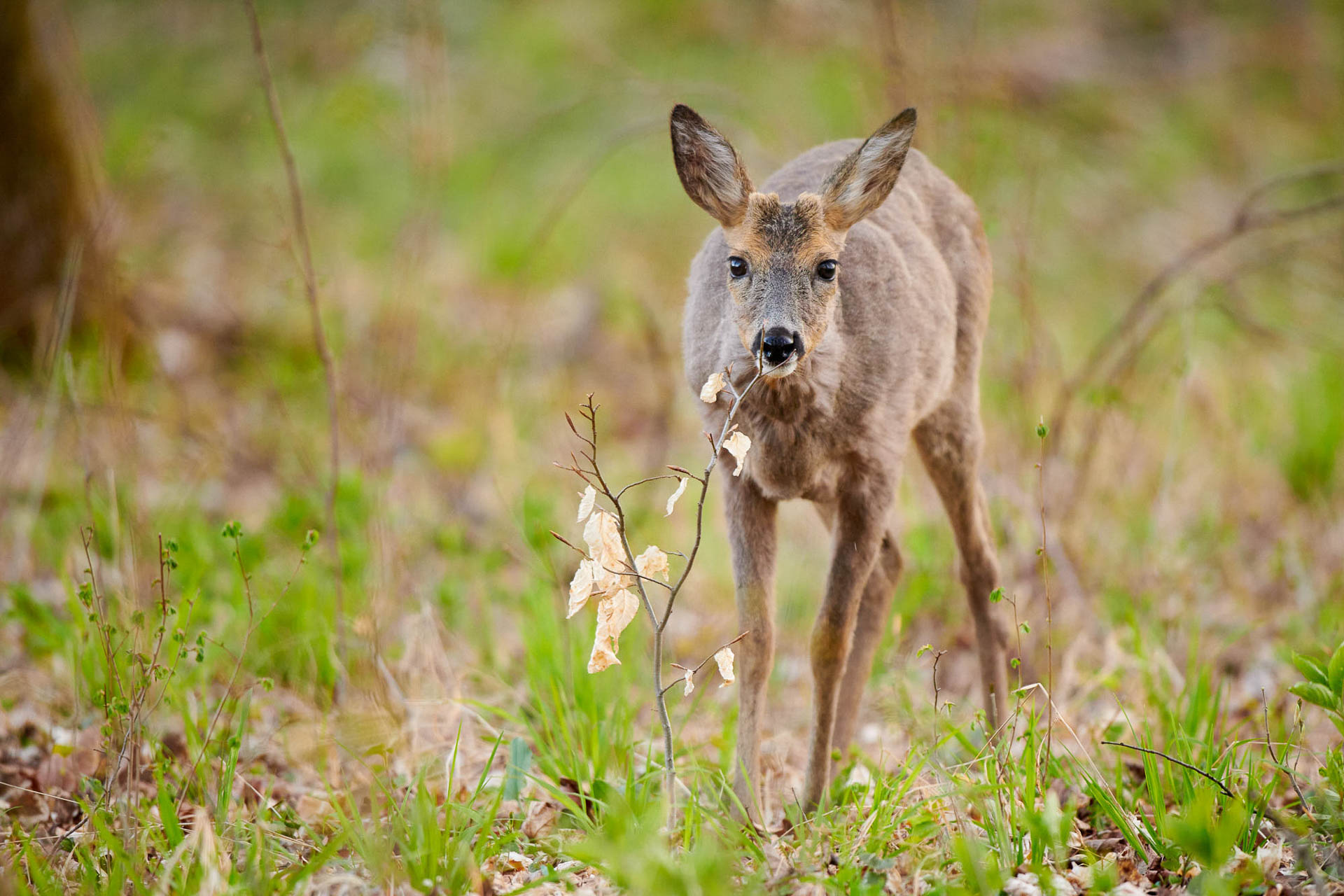 Junges Reh steht im frühlingshaften Unterholz eines Waldes.