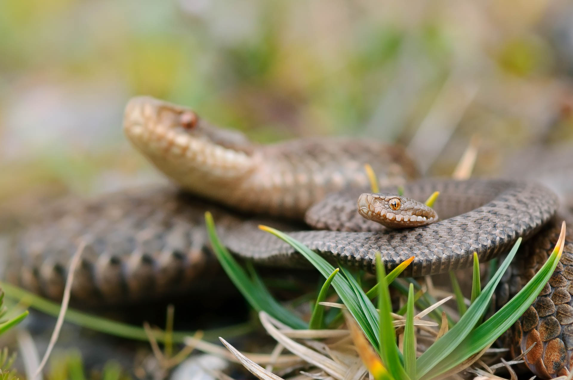 Kreuzotter mit Zickzack-Muster schlängelt sich durch Gras.